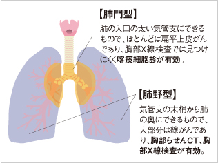 胸部X線検査は主として肺の末梢(表面に近い場所)の早期肺がんを,喀痰細胞診は主として胸部レントゲン写真だけでは判りにくい場所にある気管や太い気管支に発生する早期肺がんを発見するために役立っています(図1)。